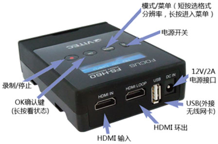 接口:HDMI 1.3(內嵌2通道音頻),環出HDMI,USB(外接無線網卡),電源口(DC 12V/2A(5-16V DC),另配3.7V/4000mAh電池,充滿電大約3-4小時)