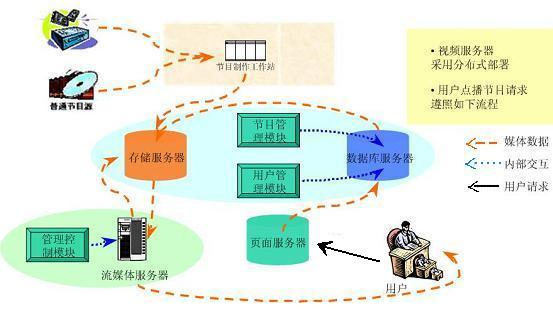 網絡視頻點播系統包括5個主要部份:節目采編錄入系統、專業視頻服務器、視頻庫、WEB服務器、客戶端播放設備。