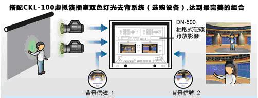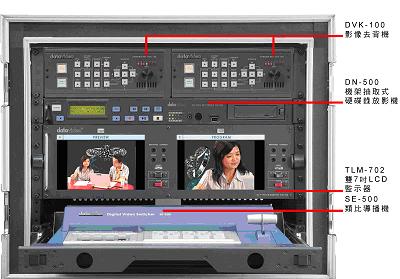 集成配備包括:2臺 DVK-100 影像去背機、SE-500 導播機、抽取式硬盤錄像機、2臺 CP-100 DVD播放器以及 TLM-702 雙7吋液晶監視器