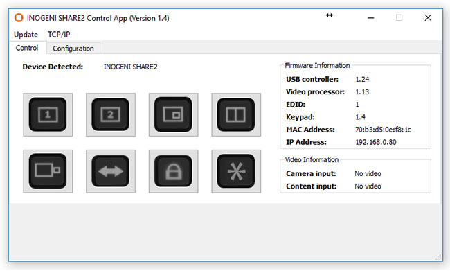 該設備具有自己的應用程序,以便使用USB HID或LAN接口控制Mixer配置。您還可以監控設備上安裝的固件版本以及攝像機和內容輸入的狀態??梢允褂酶虏藛螌⒃O備更新為最新固件。該應用程序的C++源代碼可按需提供。