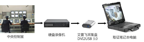 刑偵取證人員可以攜帶著筆記本電腦到控制室,然后只需將硬盤錄像機(jī)的輸出監(jiān)視口VGA或是HDMI通過(guò)線纜接入到艾普飛采集盒的輸入端,再用自帶的USB線纜接入筆記本電腦,由于艾普飛的設(shè)備非常小巧,還可以嵌入到專業(yè)的工控筆記本電腦中使用,這樣開機(jī)即可通過(guò)電腦中的專用軟件采集到硬盤錄像機(jī)的所有操作及回放視頻畫面,用此做為打擊罪范的最有力的證據(jù)。