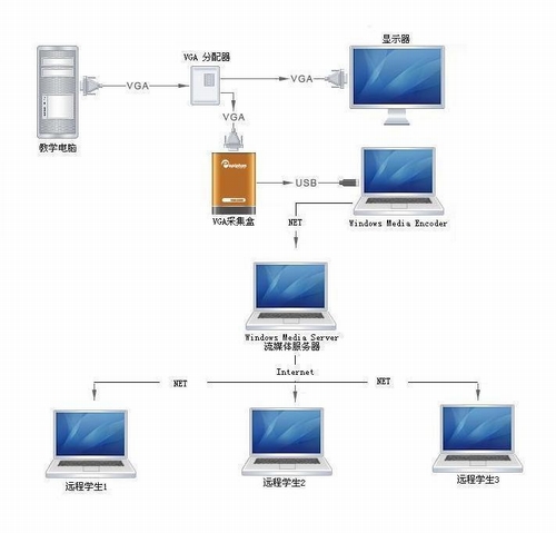 同步教學(xué)也就是實(shí)時(shí)教學(xué),其實(shí)現(xiàn)過(guò)程如下:實(shí)時(shí)教學(xué)時(shí),先把教師機(jī)(教師機(jī)需裝有麥克用來(lái)錄老師的聲音)的顯卡輸出給VGA分配器,再由VGA分配器分別輸出給顯示器和VGA采集盒(建議使用Epiphan的,本人使用過(guò)效果不錯(cuò)),采集盒需通過(guò)USB接到已安裝Windows