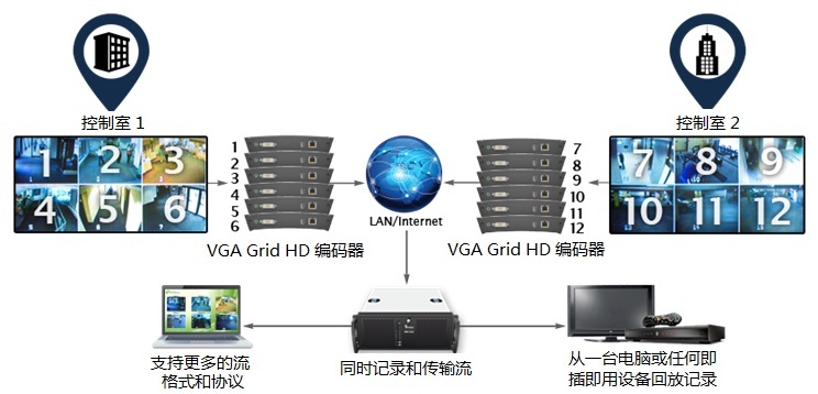 Grid搖控控制室視頻墻記錄下一個(gè)事件來(lái)采集、記錄和流傳輸多個(gè)遠(yuǎn)程視頻墻來(lái)源。這些源的每一個(gè)都可以單獨(dú)傳輸流和記錄。VGA