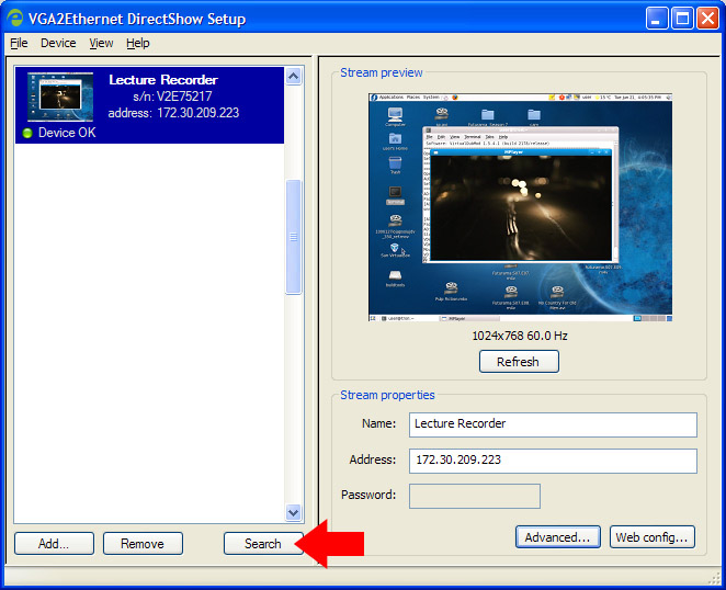 現在選擇Search搜索查找網絡上的設備。它的名稱和IP地址將顯示在名稱和地址字段處。