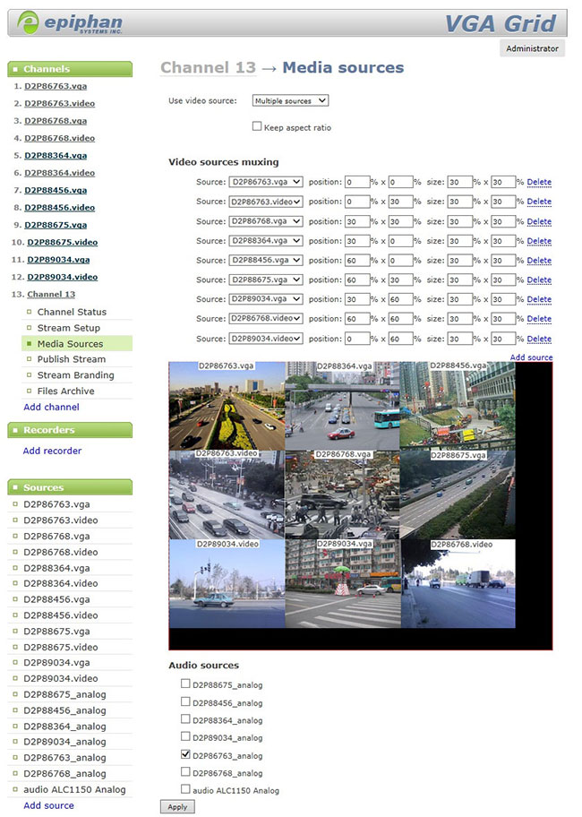 4. 點擊“Add Channel”增加通道,在“Media Sources”媒體源中選擇“Use video source”視頻源為“Multiple sources”多路源,在下方的Video sources muxing后的“Add source”可以添加更多的視頻卡,并可設置圖像的位置及大小百分比,在下方的Audio Sources中選擇本視頻所用的音頻,如下所示。
