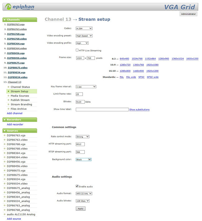 5. 點擊“Stream Setup”流設置菜單,選擇編碼的格式,分辨率大小,幀速率(更高達120bps)及碼率(更大100Mbits)和音頻的設置,完成后點擊“Apply”應用。