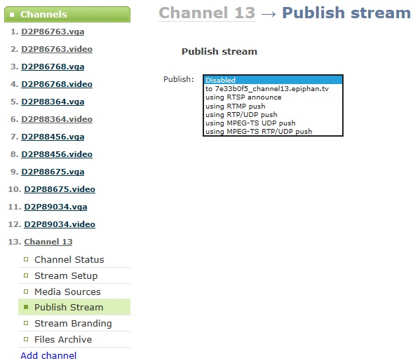 6. VGA Grid可以將編碼的視頻流發布到網絡上的服務器,點擊“Publish Stream”菜單后,在Publish后的下拉列表中選擇您要發布到服務器的方式,根據服務器要求指定信息即可推流到服務器。