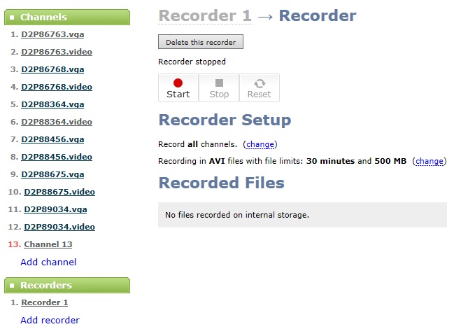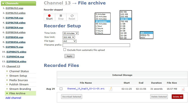 8. VGA Grid 在編碼的同時也可存儲到自身帶有的3TB硬盤中,采集時可根據時間和大小限制文件停止采集或手動停止,存儲的文件格式類型有AVI/MPEG-TS/MOV。下方的Recorded Files中的文件就是采集存儲在內部磁盤的文件,可選擇下載或刪除。