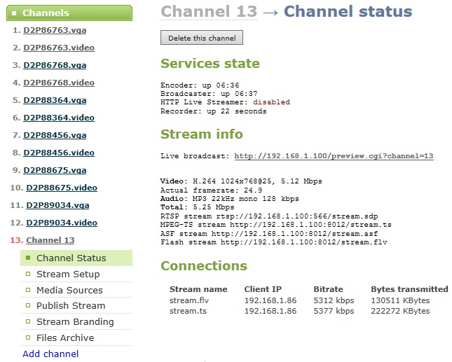 9. 點擊“Channel Status”通道狀態可查看當前通道的編碼信息及網絡傳輸的IP地址,用戶可通過VLC等能接收網絡信號的播放器輸入該IP地址后播放視頻流。