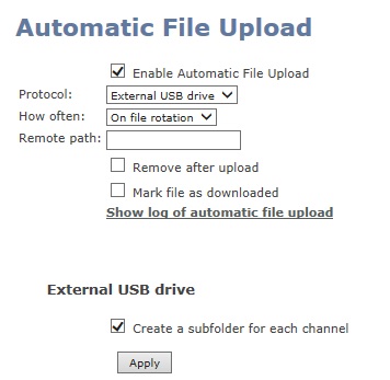 還必須將External USB drive菜單的選項設置為“used to automatically move/copy recorded files(via Automatic File Upload)”,現在當你插入USB存儲設備后,等待記錄停止后會自動將文件拷入到USB設備中。
