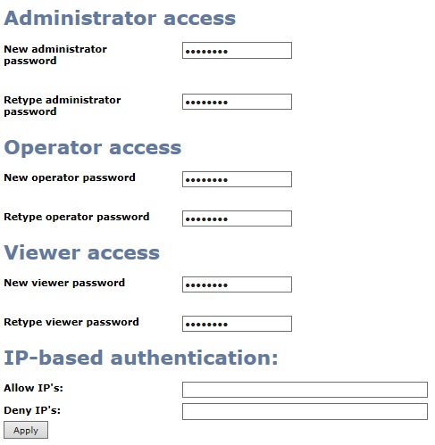 14.VGA Grid提供了多種用戶級別權限,管理員權限更高;操作者只能操作編碼,不能對系統設置;瀏覽者只能瀏覽,也可通過允許IP或拒絕IP來設置讓哪些機器訪問,如下圖示。