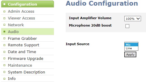 6. 在“Audio”項(xiàng)菜單下選擇輸入的音頻源類型,也可以調(diào)整音頻的增益。