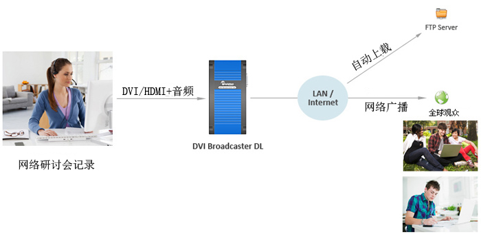 DVI Broadcaster DL可以錄制和直播視頻/音頻源的數據。您可以將DVI / DVI 雙鏈路/ HDMI和音頻信號源連接到該設備,將其記錄并在網絡上播放。那些未能出席的人們可以事后查看材料。它會被自動推送至FTP服務器。正是由于記錄功能,人們可以根據工作、家庭或其他需求查看網絡研討會資料。