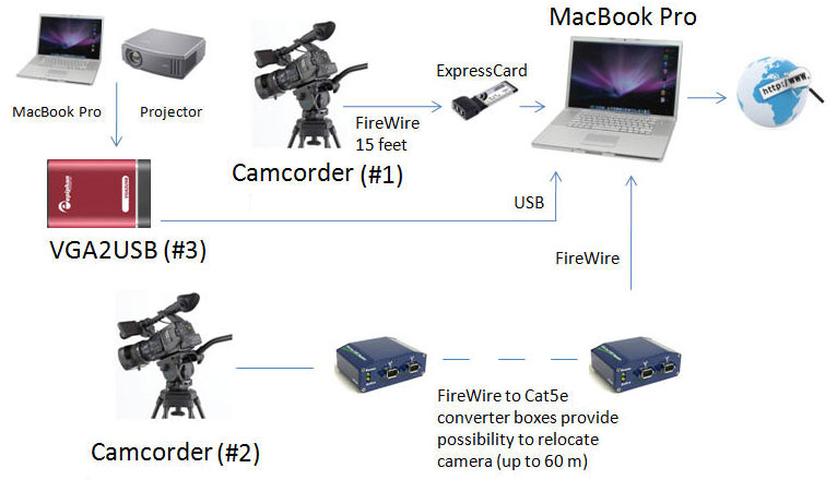 使用的這款筆記本電腦是具有一個FireWire總線的MacBook Pro。所以,你需要一個FireWire / USB ExpressCard來添加另一個FireWire連接。此外,為了更方便,使用了 FireWire 到 Cat5e 轉換盒。 FireWire僅充許傳4.5米,而現在可以使用到的最大長度達60米。在這個例子中,主相機是固定的,如果需要的話,另一個可以很容易地重新定位到另一個地方。