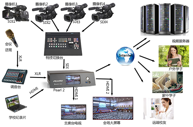 大會期間采用了4臺攝像機進行全程多角度拍攝,后將信號傳輸給特技切換臺,再由切換臺輸出視頻給Pearl 2。音頻通過會場調(diào)音臺輸出接入Pearl 2的平衡音頻輸入,通過自由搭配音頻源,保證了音頻的無雜音效果。后將播放學(xué)校紀錄片視頻的筆記本電腦HDMI輸出給Pearl 2的HDMI輸入,并通過本身的導(dǎo)播切換功能實現(xiàn)攝像機與紀錄片視頻的無縫切換。再將Pearl 2的兩個HDMI輸出一路給主席臺的電視供主持人監(jiān)看,一路給會場的大屏供全場人員觀看,最后將視頻流推到校園的視頻服務(wù)器上,供未能到場的校友,教師及學(xué)子觀看。